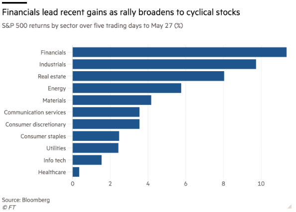 Οι κυκλικές μετοχές και οι μετοχές εταιρειών μικρής κεφαλαιοποίησης συμμετέχουν στο ράλι τις τελευταίες εβδομάδες, καθώς οι επενδυτές στηρίζουν εκ νέου τις οικονομικά ευαίσθητες εταιρείες. Την Τρίτη οι τραπεζικές μετοχές εμφάνισαν τις καλύτερες ημερήσιες επιδόσεις τους από τις αρχές Απριλίου, υποδηλώνοντας πως το ράλι μπορεί να διαρκέσει, όπως δήλωσε ο Mike Mullaney, διευθυντής έρευνας παγκόσμιων αγορών στην εταιρεία fund management Boston Partners. «Δεν μπορείς να αφήσεις τον χρηματοπιστωτικό κλάδο πίσω και να περιμένεις πως το ράλι θα έχει διάρκεια – οι τράπεζες είναι η ραχοκοκαλιά της οικονομίας,», είπε.